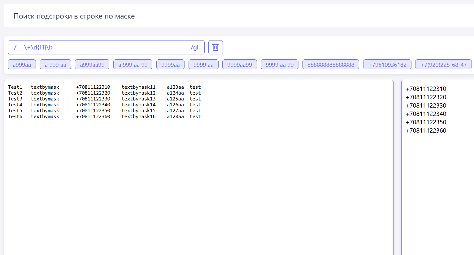 В данном примере мы выбрали +79510936182, т.е. поиск в тексте номера телефона именно такого вида (результат поиска отображается справа):